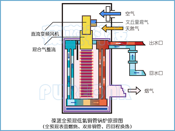 葆藍(lán)翅片銅管鍋爐四回程即使式換熱結(jié)構(gòu),燃燒室、次冷凝室、主冷凝室三室分離結(jié)構(gòu),壽命超長(zhǎng),導(dǎo)熱快,加熱精準(zhǔn)。